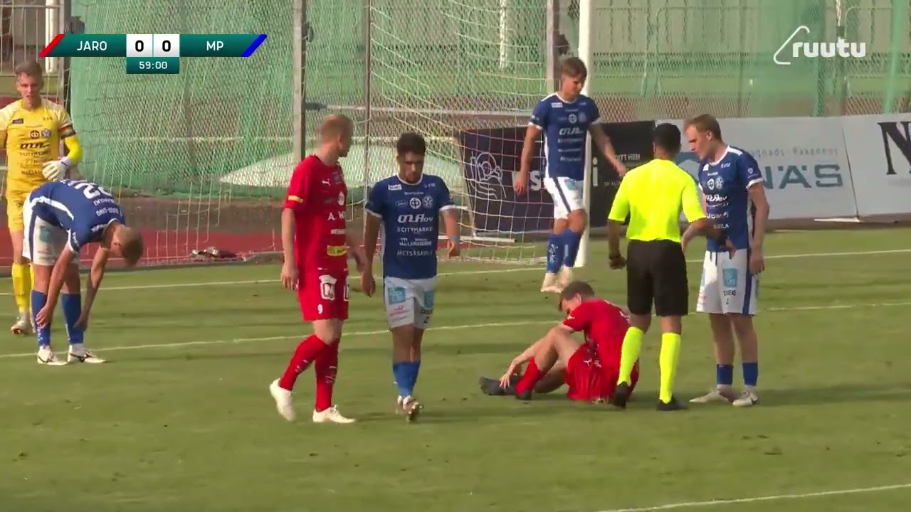 i den 60:e min uten var ett ledningsmål för FF Jaro mer än nära. Michael Ogungbaro tog sig fram på högerkanten och gav ett lågt inlägg som målvakten boxade ut rakt i fötterna på en helt fri Kähkönen. Kähkönens hårda skott blockerades och bollen studsade ut till vänster till Edvin Crona. Cronas placering gick förbi målvakten mot den bakre stolpen. men en MP spelare dök upp strax före mållinjen och rensade.